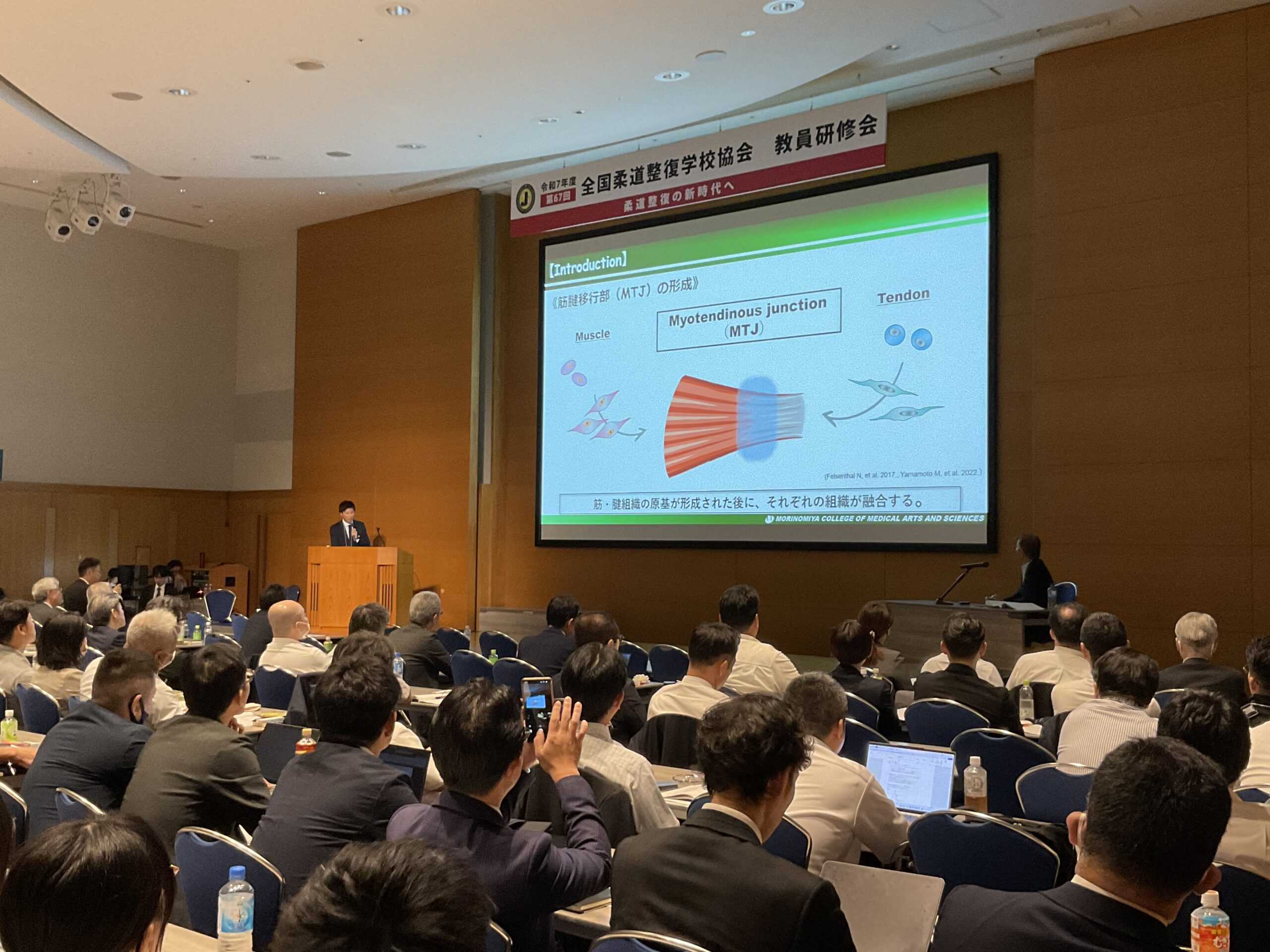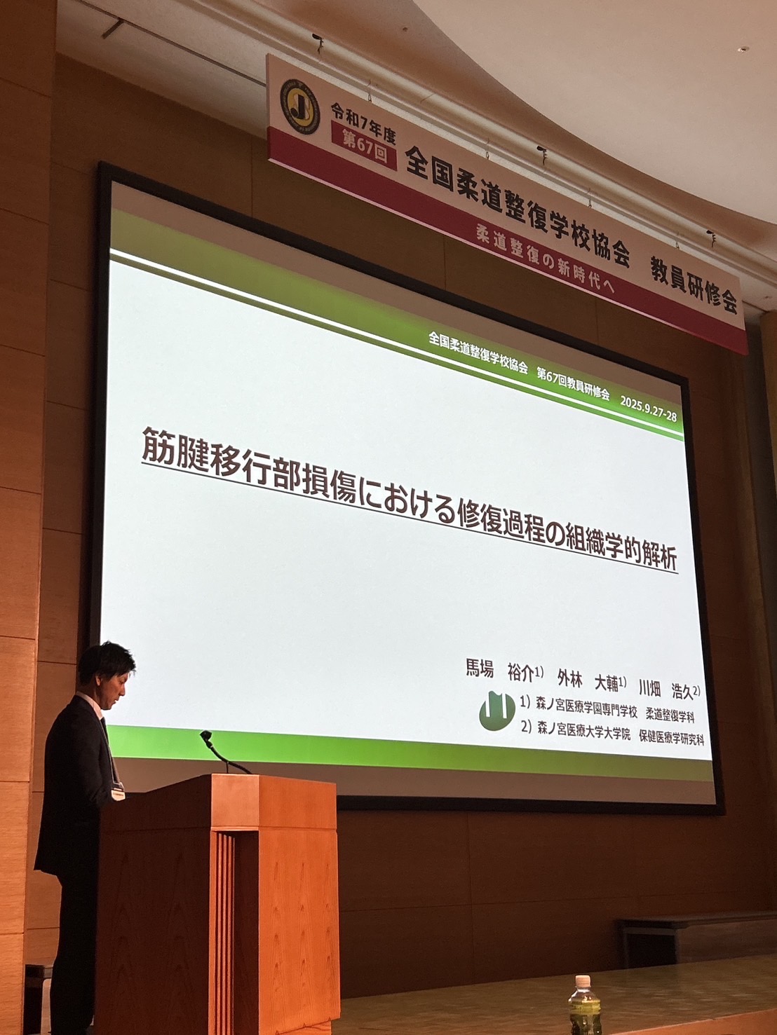 2025年9月27日(土)・28日(日)の2日間に渡り福岡国際会議場で開催された、全国柔道整復学校協会主催の第67回教員研修会において、本校柔道整復学科教員の馬場裕介先生が「筋腱移行部損傷における修復過程の組織学的解析」という演題で発表を行いました。