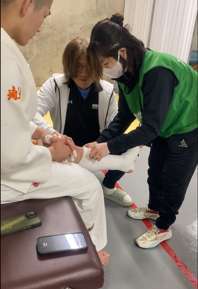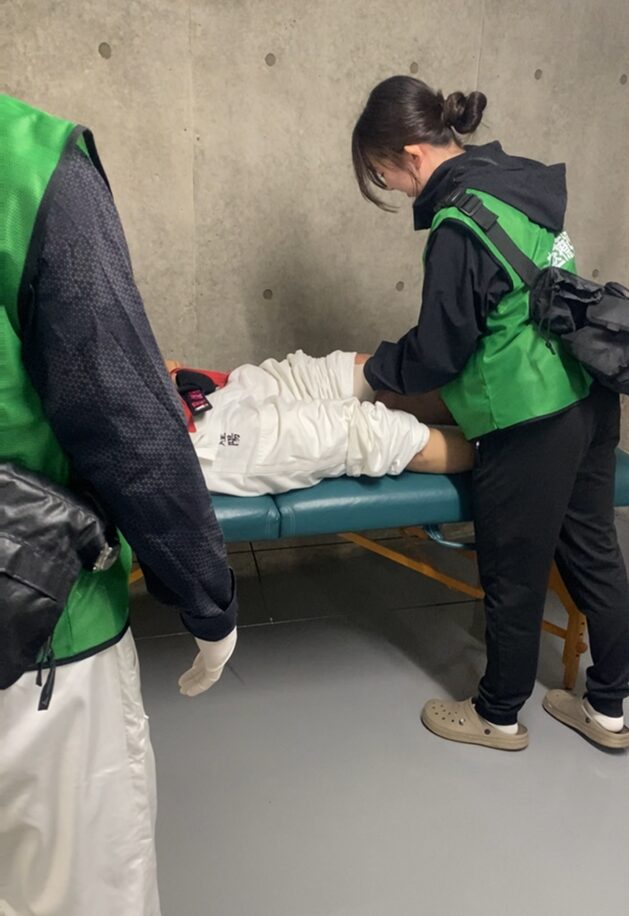 現場で求められる迅速な状況判断や、痛みに対する適切な評価、そして選手への配慮ある対応など、プロフェッショナルとしての教員の動きを間近で学びながら、実際の救護助手にも携わりました。