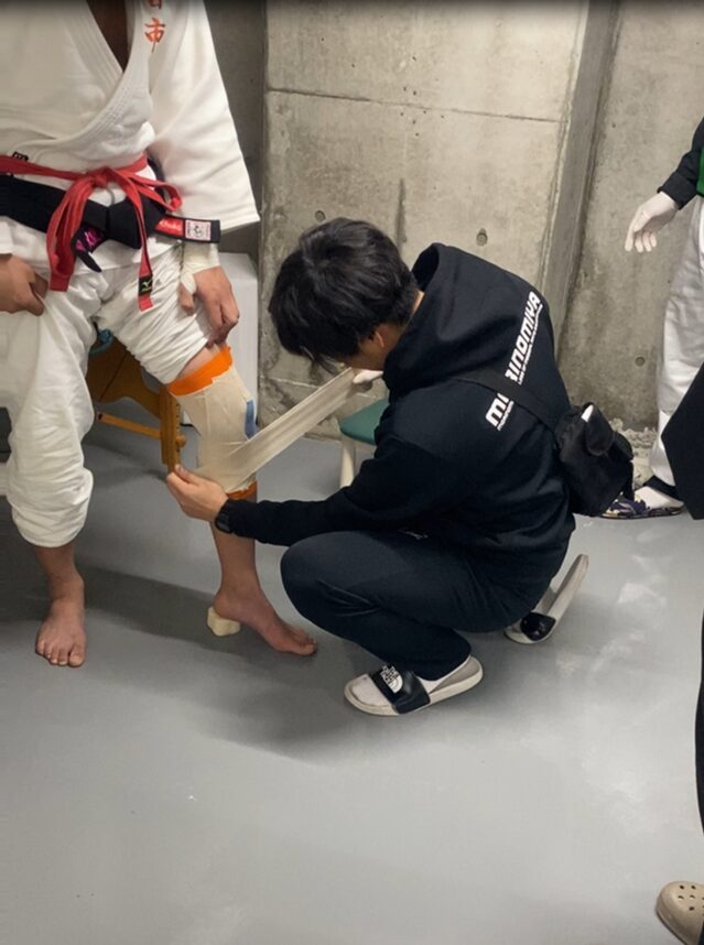 2日間で約700名の選手が白熱した試合を繰り広げる中、柔道という競技の特性上、どうしても発生してしまう突発的な外傷やケガ。学生たちは専任教員の直接的な指導・監督のもと、救護スペースや試合場でのサポート活動にあたりました。